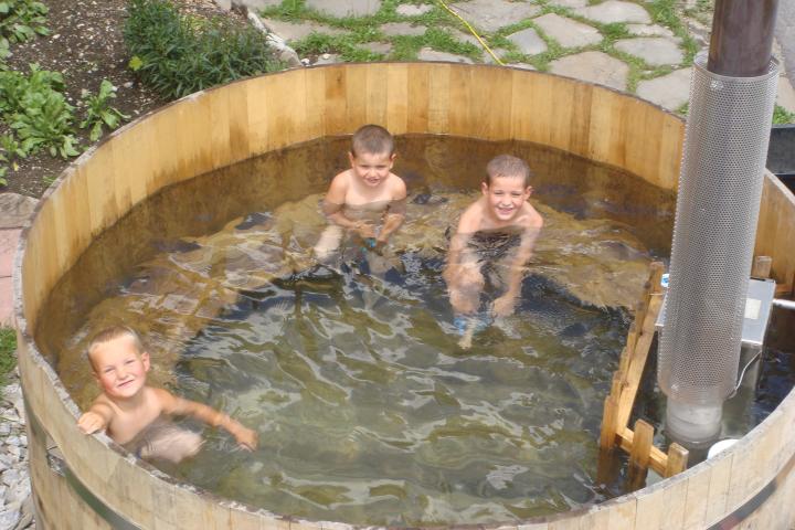 Holzpool aus Esche mit Unterwasserholzofen. Der Ofen wird von oben mit Holz gefeuert. Hiermit ist Badespaß für Groß und Klein ganzjährig garantiert.